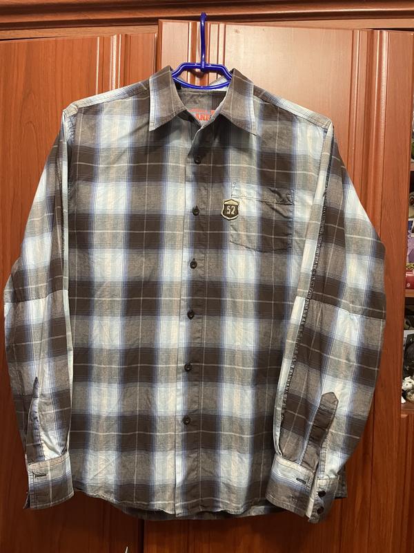 Сорочка чоловіча в клітинку. Гарна легка дуже хорошої якості. Рукави можна підвертати, знизу рукави, як від футболки на довгий рукав. Зверху прошито зовнішніми швами.Клітинка трьохколірна: сірий, голубий, коричневий.Всі заміри на фото.