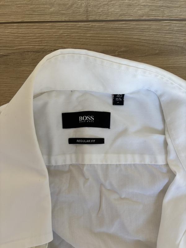 Біла сорочка від Hugo Boss з довгим рукавом. Розмір 40 (15 3/4) або приблизно М. Вдягнув кілька разів, білий колір не «випраний». Під руками і манжети -ідеально біле. Трішки жовтизна на комірці, додав фото крупним планом.