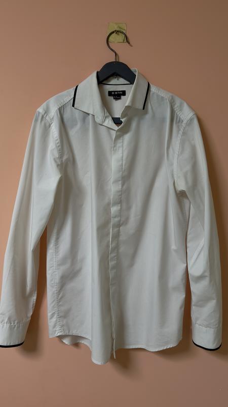 Сорочка бренду Ostin, розмір M-L. Стан чудовий. Є імітація «галстук» під смокінг або піджак. Офіційний стиль, приталена. Склад: 62% коттон, 33% поліестер, 5% еластан. Гарно сидить на тілі та підкреслює фігуру. Заміри: Плечі - 44,5 см По грудях - 52 см Рукава - 62 см Довжина - 76 см