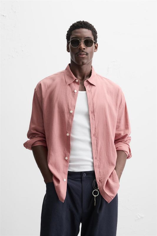 Віскозно-лляна сорочка вільного крою з класичним коміром. Довгі рукави з ґудзиками на манжетах. Бічні розрізи внизу. Застібається на ґудзики спереду. Розмір по бірці L Довжина по спині 73 см Плечі 54 см Груди 58,5 см Рукав від плеча 61 см (від коміра 83 см) 52% льон, 48% віскоза Рожевий колір