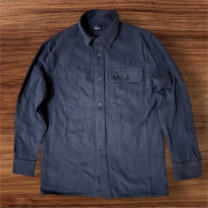 Fred Perry Twill Utility Overshirt, темно-синя. Щільна саржева бавовна, utility-стиль з нагрудною кишенею та лавровим вінком. Стан добрий, мінімальні сліди носки, ідеальна для осені/весни. Розмір на фото S, проте більше підходить на M, наближено до L.