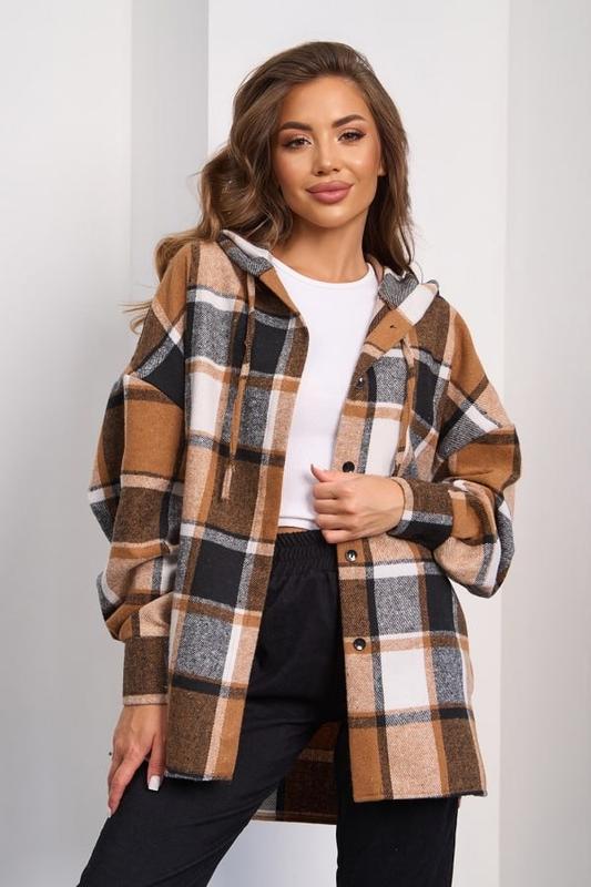 мод 15290 сорочка в клітинку з капюшоном оверсайз застібається на гудзики тканина вовна Розміри С,М,Л,ХЛ,2ХЛ,3ХЛ