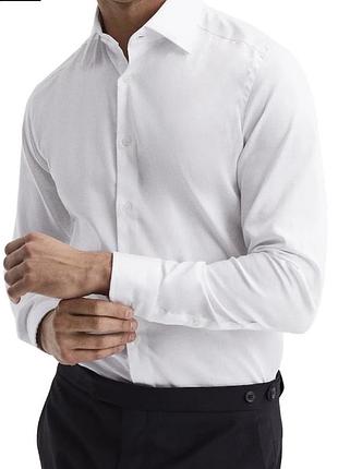Сорочка від бренду Reiss виготовлена з бавовни та еластану високої якості. Модель виконана у прямому крої. Має класичний відкладний комір, планку з гудзиками та довгі рукави з манжетами. Розмір XL. Матеріали: 96% бавовна, 4% еластан.