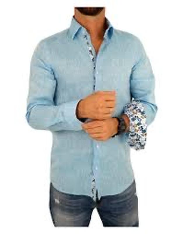 Це блакитна лляна сорочка Zara Man з коміром на ґудзиках та манжетами з квітковим візерунком. Недолік: на манжетах основні ґудзики половинчаті(