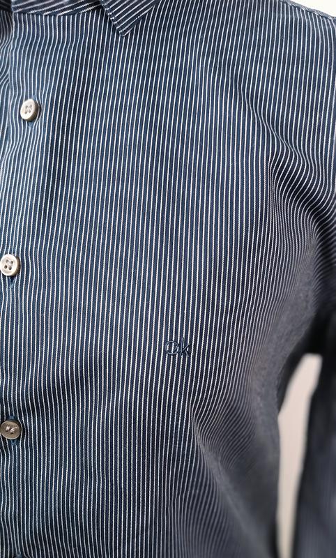 котоновая рубашка темно синяя в белую тонкую полоску ширина между подмышками 48 плечи 44, длина 76, рукав 68