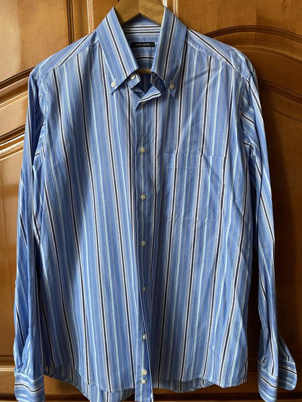 Чоловіча сорочка в синьо-блакитну вертикальну смужку від бренду Paul King. Модель має комір на ґудзиках (button-down), довгі рукави та накладну нагрудну кишеню зліва. Класичний або регулярний крій (Regular Fit), що підходить для повсякденного носіння в офісі або на неформальних заходах. Напів об’єм грудей-60 Рукав від шиї-86 Довжина по спинці-80
