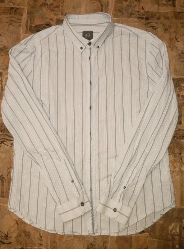 Рубашка Armani Exchange (Италия). Оригинал. Цвет: основной - бледно-бирюзовый. Состав: 86% хлопок, 9% вискоза, 4% полиамид, 1% полиэстер. Размер: заявлен Л. Замеры: подмышки 55; плечи 52; рукав 68; длина от ворота 76; длина от подмышки 39; ширина внизу 57. Изготовлена: в Индии. Особенности: - довольно сложный состав, тонкая блестящая полоска; - фронтальная планка состоит из 2 половинок и прикрывает пуговицы; - лого-нашивка внизу на планке; - воротник на пуговицах, 2 запасных пуговицы, все пуговицы брендированные; - 2 защипа на спине. Состояние - отличное без замечаний. Якість і індивідуальність. Дуже ошатна.