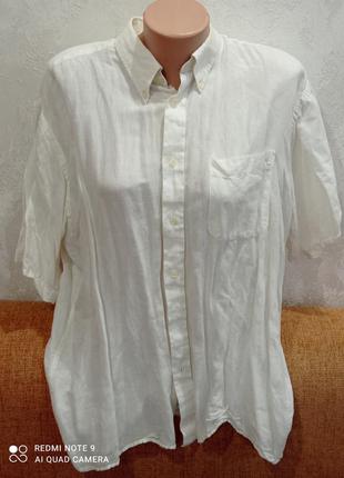 Рубашка мужская 100 % лен.Вещь в очень хорошем состоянии.Следов носки нет. Воротник не потертый.Размерная сетка L.Воротник 41 см.Ширина спинки 52 см,ширина изделия под мышками 64 см,длина изделия по спинке 77см,длина рукава 26 см.Плече от шеи до проймы 19см. Склад: 100 % лен