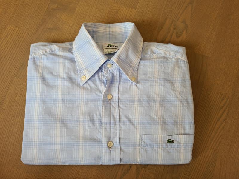 Чоловіча сорочка Lacoste Size 38 Орієнтуйтеся на обміри. Доп.фото за запитом. Заміри: Плечі - 45см Груди - 52см Рукав від плеча - 63див Рукав від пахви - 51см, Довжина по спині - 78см В Києві можна зустрітися, подивитися, поміряти.