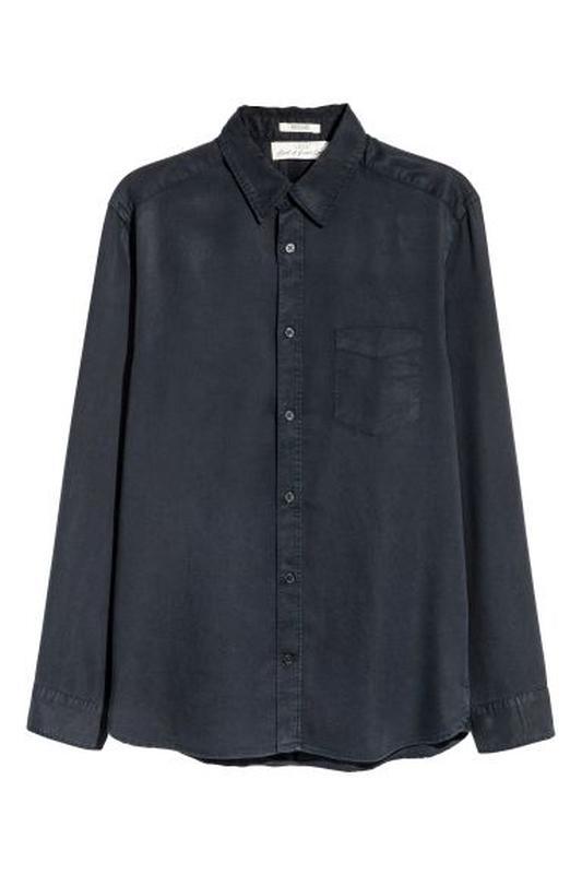 Рубашка с длинным рукавом из стираного твила из Tencel™-лиоцелла. У рубашки отложной воротник со стойкой и нагрудный карман. На спинке отрезная кокетка и петелька. Низ скруглен. Regular fit.