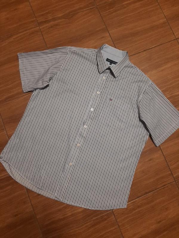 Практичная базовая тенниска от Hilfiger. Размер XL. Замер: плечи 48см, пог 65см, длина 77см, рукав 25см, воротник 42см. Гудзики с логотипом бренда. Есть несколько малозаметных точек от шариковой ручки, фото 8.