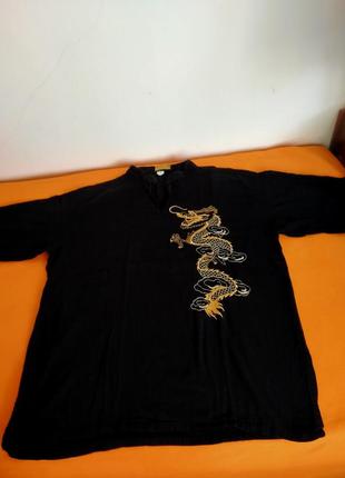 Дуже тонкої бавовни чорна сорочка з коротким рукавом. Окрасою служить вишита золотою ниткою дракон. Якісна і незвичайна річ. Розмір вказано L. Виміри див. Плечі 51, пахви 58, довжина рв спині 70, рукав від плеча 24.