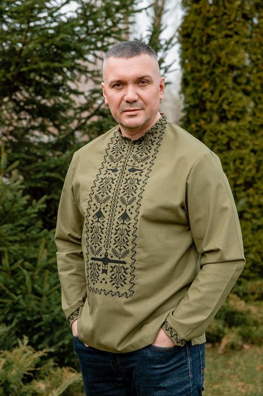 колір- льон розмір 46 48 50 52 54 56 58 Наша вишиванка для чоловіків має багато переваг: Прямий вільний крій Комір-стійка з вишивкою Нагрудна потайна планка з ґудзиком Патріотичний візерунок, який вишитий хрестиком Довгий рукав з вишитим манжетом та застібкою на ґудзику