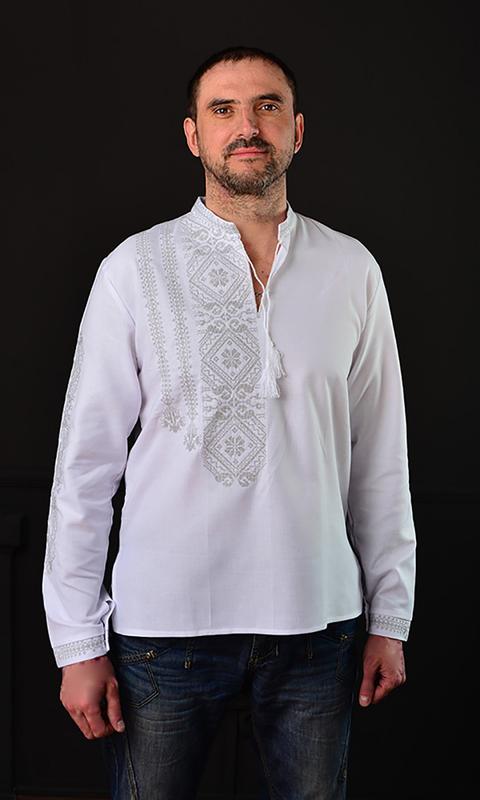 Чоловіча сорочка з геометричним орнаментом сірого кольору. Матеріал – бавовна, вишивка – машинна. Узор вертикально розміщений по одній стороні сорочки, що надає вишиванці особливого сучасного стилю. Практична та стильна річ в гардеробі. Розміри: 42-58 Від 52 р +200 грн Від 58 р +300 грн