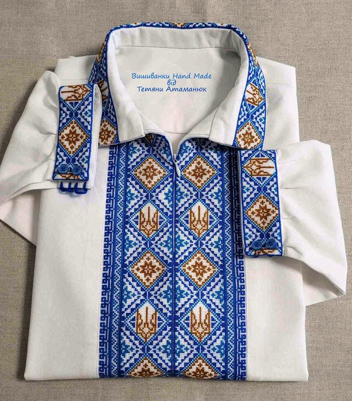 Вишиванка ручної роботи на домотканому полотні "Патріотична"(розмір XXL/56) вишиті вставки Тризуб є одним із найдавніших символів, відомих людству. В давнину тризуб використовувався в різноманітних символах, пов'язаних із числом 3, яке вважалося священним практично всіма народами. Це культ Вогню (який є життєвою силою), культ мудрого Змія, культ Великої Праматері - Родоначальниці. Число три, троїстість (тривимірність) життєвого простору, поєднання трьох основ буття - головна ідея тризубу. Абсолют, тобто повна врівноваженість усіх енергій є основою світобудови. Порушення цієї рівноваги - два протилежні полюси: негативний і позитивний, батьківське і материнське, чоловіче і жіноче начало. Поєднання цих протилежних сил породжує третю - синівську силу, що і відображає тризуб. Тризуб на українських землях має багатотисячолітню безперервну традицію, він є національним символом і символом України як держави. Вишиванка виконана в національних українських кольорах. Для вишивання використаний давній український орнамент. Дана сорочка ідеально підійде для чоловіків із ярко-вираженим почуттям патріотичності. - ### Вишиванка Handmade для чоловіків - розмір (XXL); - ### Тканина - домоткане полотно, 100% бавовна; - ### Вишивка акриловими нитками, вишиті вставки і акуратно вшиті у тканину; - ### Горловина на кнопці чи замку; - ### з довгим рукавом; Розмірна сітка для визначення потрібного розміру вишиванки (розміри вказані за мірками ЛЮДИНИ*) * Якщо знімаєте мірки з готового виробу, тоді не дивуйтеся, що ширина сорочки є більшою (~<10 см), за вказану у таблиці. Все вірно, адже виріб повинен бути вільним, забезпечувати свободу та комфорт у пересуванні. РІСТ (см) Міжнародний розмір Український розмір Обхват шиї(см) Обхват грудей(см) Обхват талії(см) Довжина рукава (см) 168 XXS 44 37 88 78 61 171 XS 46 38 92 82 62 174 S 48 39 96 86 63 177 M 50 40 100 90 64 180 L 52 41 104 94 65 182 XL 54 42 108 98 66 184 XXL 56 43 112 104 67 Не знайшли у даній таблиці потрібного розміру вишиванки? Це не привід залишати наш магазин. ************************** Телефонуйте чи звертайтеся через форму зв'язку на головній сторінці, пошиємо вишиванку під замовлення. В нашому інтернет- магазині ************************** Ви маєте можливість придбати високоякісний етнічний одяг ручної роботи, а також замовити вишиванку ручної роботи під індивідуальне замовлення!