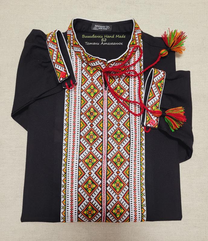 ### Чоловіча вишиванка ручної роботи на домотканому полотні "Чорна колоритна" р.2XL(56)_вишиті вставки - ### Вишиванка Handmade для чоловіків - ### Тканина - домоткане полотно, 100% бавовна; - ### Вишиті вставки та акуратно вшиті в тканину; - ### Вишивка технікою хрестик, акриловими нитками; - ### Горловина на замку; - ### З довгим рукавом; Розмірна сітка для визначення потрібного розміру вишиванки (розміри вказані за мірками ЛЮДИНИ*) * Якщо знімаєте мірки з готового виробу, тоді не дивуйтеся, що ширина сорочки є більшою (~<10 см), за вказану у таблиці. Все вірно, адже виріб повинен бути вільним, забезпечувати свободу та комфорт у пересуванні. РІСТ (см) Міжнародний розмір Український розмір Обхват шиї(см) Обхват грудей(см) Обхват талії(см) Довжина рукава (см) 168 XXS 44 37 88 78 61 171 XS 46 38 92 82 62 174 S 48 39 96 86 63 177 M 50 40 100 90 64 180 L 52 41 104 94 65 182 XL 54 42 108 98 66 184 XXL 56 43 112 104 67 184 XXXL 58-60 44-45 116-120 108-112 67 Не знайшли у даній таблиці потрібного розміру вишиванки? Це не привід залишати наш магазин. ************************** Телефонуйте чи звертайтеся через форму зв'язку на головній сторінці, пошиємо вишиванку під замовлення. В нашому інтернет-магазині ************************** ви маєте можливість придбати високоякісний етнічний одяг ручної роботи, а також замовити вишиванку ручної роботи під індивідуальне замовлення!
