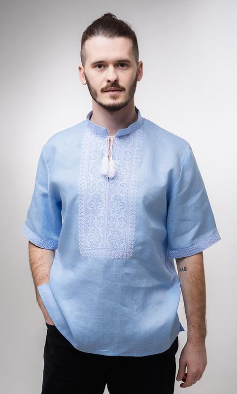 Вишиванка чоловіча сорочка з коротким рукавом блакитна вишита сорочка з льону 344