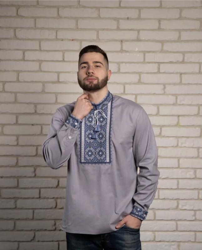 Мужская рубашка вышиванка серая с сине-белой вышивкой