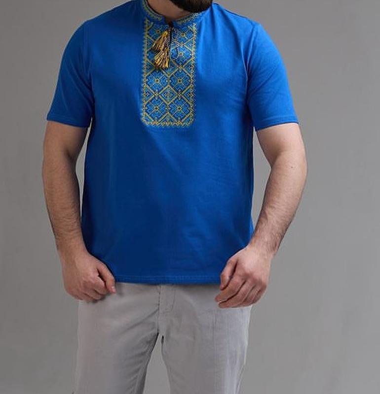Чоловіча вишиванка синього кольору з жовтим орнаментом