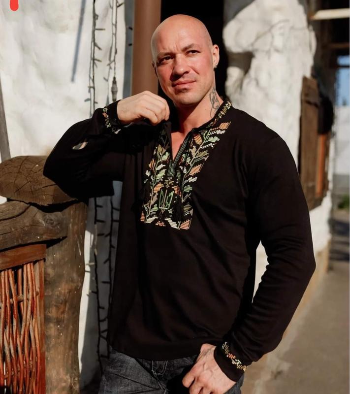 Полотно: Інтерлок Розмір: 44-56 Декор: Вишивка Полотно: інтерлок чорний Склад полотна: 100% бавовна .Бездоганна, класична чоловіча вишиванка з чорного інтерлока. У виробі класичний прямий крій, довгі рукава, краї коміра-стійки з'єднуються декоративними шнурками-зав'язками з довгими китичками. Багата вишивка з традиційним орнаментом прикрашає виріб спереду, края рукавів та комір.