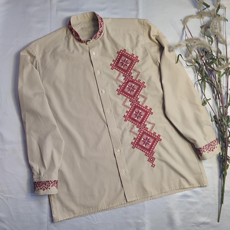 Вишита сорочка чоловіча ◽Ціна 1000 грн ◽ Тканина: поплін (сорочкова) ◽Колір: бежевий ◽Розмір: 3ХL-4ХL (56-58) ◽Заміри: ПОГ 63 Довжина 78 Довжина рукава 63,5
