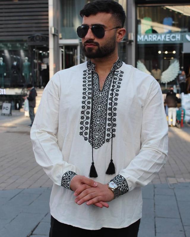 Вышитая рубашка Размеры: S, M, L, XL, 2XL Цвета: черный, белый Тканина: бавовна Замеры: S: ОГ 112см, низ 114 см Длина рукава от горловины 88 см Длина 78 см М: ОГ 114 см, низ 116 см Длина рукава от горловины 89 см Длина 79 см L: ОГ 116см, низ 118 см Длина рукава от горловины 90 см Длина 80 см Xl: ОГ 122 см, низ 124 см Длина рукава от горловины 91 см Длина 81 см XXL: ОГ 128 см. Низ 130 см Рукав от горловины 93 см Длина 82