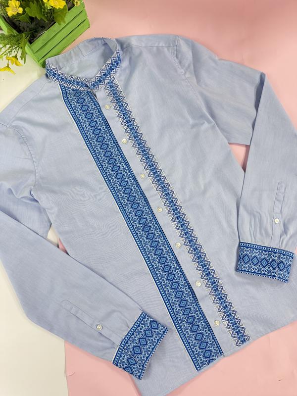 Вишиванка чоловіча голубого кольору. Розмір 46. Виконана із якісної бавовняної тканини оздоблена машинною вишивкою. Горловина на завʼязках, рукав довгий застібається на кнопки. Дуже гарний колір. Підійде для підлітка або для худощавого мужчини
