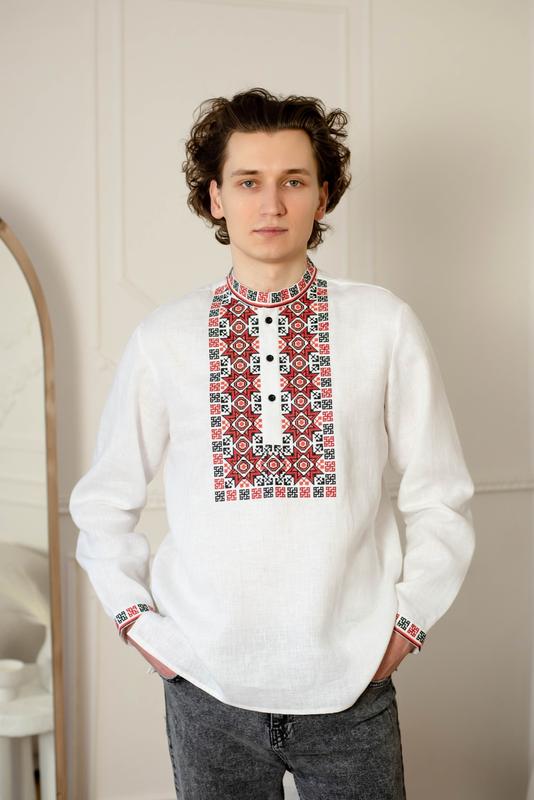 виготовлена з білого льону, що забезпечує комфорт і легкість у носінні. Вишивка в чорно-червоно-бордовій гамі надає сорочці виразності та глибини, поєднуючи традиційні українські мотиви з сучасним стилем. Геометричний орнамент символізує родючість та достаток, роблячи цю сорочку не лише стильним, а й символічним елементом гардеробу.