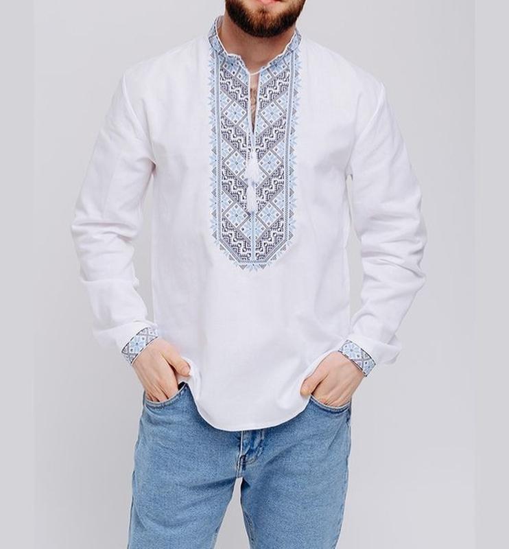 Таблиця розмірів на фото. Заміри по виробу: 42 розмір: обхват грудей по виробу 94-96 см, довжина виробу 64-65 см, довжина рукава 60-61 см 44 розмір: обхват грудей по виробу 98-100 см, довжина виробу 65-66 см, довжина рукава 63-64 см 46 розмір: обхват грудей по виробу 102-104 см, довжина виробу 69-70 см, довжина рукава 64-65 см 48 розмір: обхват грудей по виробу 106-108 см, довжина виробу 70-71 см, довжина рукава 65-66 см 50 розмір: обхват грудей по виробу 110-112 см, довжина виробу 73-74 см, довжина рукава 66-67 см 52 розмір: обхват грудей по виробу 116-118 см, довжина виробу 76-77 см, довжина рукава 66-67 см. Оригінальна біла чоловіча вишиванка на домотканому полотні з вишитим орнаментом. Модель вільного крою з комірцем-стійкою, неглибоким вирізом з зав'язками-кутасиками, довгими просторими рукавами з манжетами на застібці. Сорочка оздоблена геометричним узором. Тканина: 48% бавовна, 52% поліестер.
