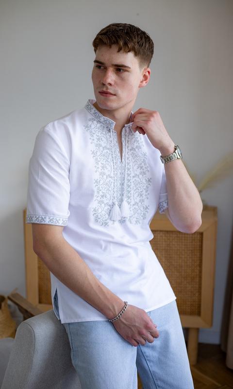 Красива чоловіча вишита сорочка класичного покрою з коротким рукавами і з коміром-стійкою. ‼️Наявність розміру уточнюйте. Якщо сорочки необхідного розміру немає в наявності, ми з радістю виготовимо її для Вас. ❗❗❗ Сірий візерунок вишитий машинною вишивкою по основі вишиванки спереду, на комірі і на манжетах. Тканина сорочки - домоткане полотно Розміри 42-62 Від 54 р +200 грн від 60 +300 грн