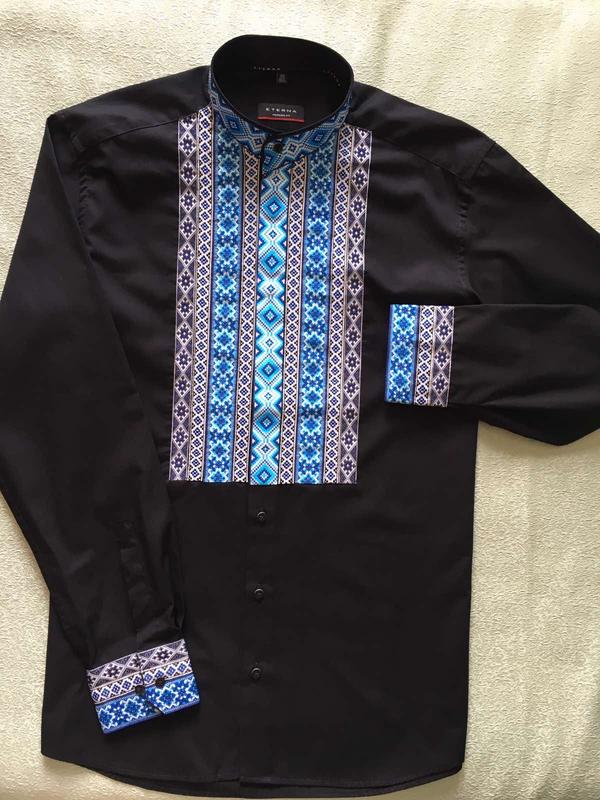 Сорочка вишита стрічками з українським орнаментом. Вишивка обʼємна (не друк) Крій приталений. Застібається на ґудзики. Колір сорочки-чорний Заміри: Плечі-48 см Пог{пахви}-56 см Талія-52 см Довжина рукава-65 см Довжина-77 см Є багато інших варіантів і розмірів, дивіться в моїх оголошеннях.