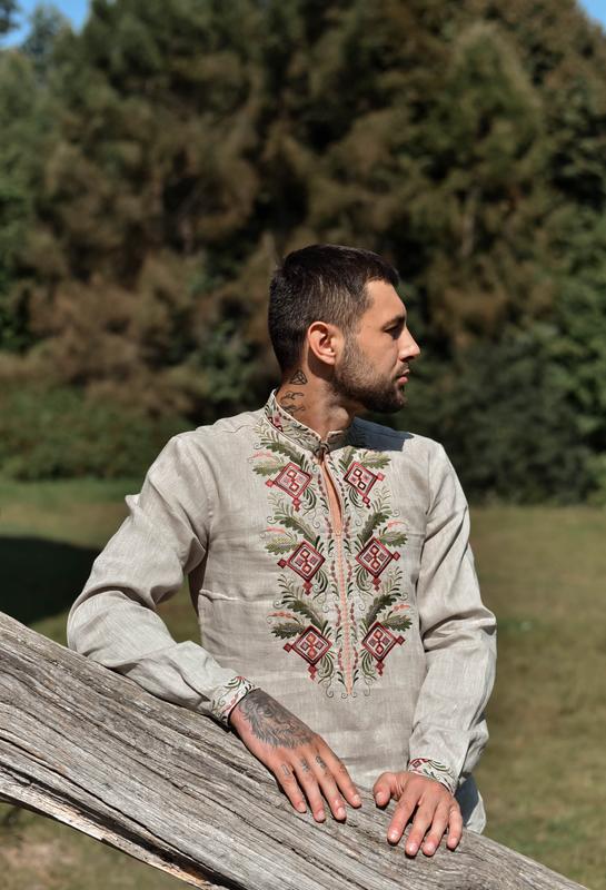 Рубашка мужская из гладкокрашенного льна,свободного кроя. Рукава втачные рубашечного кроя с вышитыми манжетами. По боковым швам разрезы для свободы размера 42-64 вышиванка с длинным рукавом. Вышивка машинная, по ткани. Под горловиной вертикальный разрез, стягивающийся традиционной завязкой-шнурком. Крой свободный, прямой, с распорками по бокам. 42 размер: обхват груди по изделию – 102 см, обхват горловины – 41 см, длина рукава – 65 см, длина изделия – 70 см 44 размер: обхват груди по изделию – 106 см, обхват горловины – 42 см, длина рукава – 65,5 см, длина изделия – 71 см 46 размер: объем груди по изделию – 110 см, обхват горловины – 43 см, длина рукава – 66 см, длина изделия – 72 см 48 размер: объем груди по изделию – 114 см, обхват горловины – 44 см, длина рукава – 66,5 см, длина изделия – 73 см. 50 размер: объем груди по изделию – 118 см, обхват горловины – 45 см, длина рукава – 67 см, длина изделия – 74 см 52 размер: объем груди по изделию – 122 см, обхват горловины – 46 см, длина рукава – 67,5 см, длина изделия – 75,5 см 54 размер: объем груди по изделию – 126 см, обхват горловины – 47 см, длина рукава – 68 см, длина изделия – 77 см 56 размер: объем груди по изделию – 130 см, обхват горловины – 48 см, длина рукава – 68,5 см, длина изделия – 78,5 см 58 размер: обхват груди по изделию – 134 см, обхват горловины – 49 см, длина рукава – 68,5 см, длина изделия – 80 см. 60 размер: объем груди по изделию – 138 см, обхват горловины – 50 см, длина рукава – 69 см, длина изделия – 81 см 62 размер: объем груди по изделию – 142 см, обхват горловины – 51 см, длина рукава – 69 см, длина изделия – 82 см 64 размер: объем груди по изделию – 146 см, обхват горловины – 52 см, длина рукава – 69 см, длина изделия – 83 см
