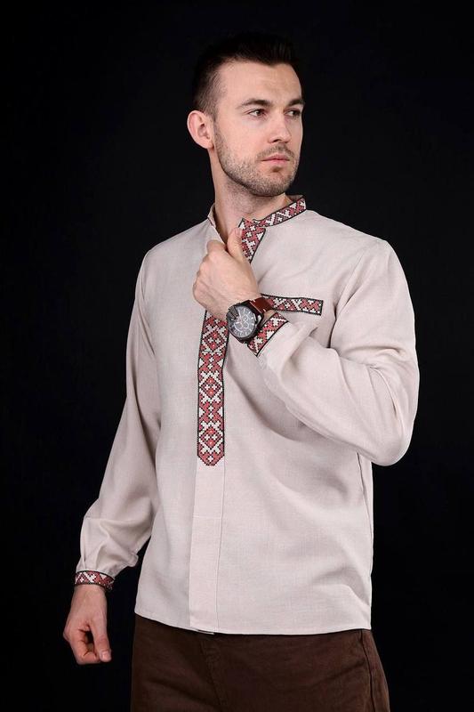 🔅Сорочки вишиванки чоловічі🔅 Виробник Україна 🏷Матеріал: льон габардин, машинна вишивка хрестиком. Застібається на кнопки. 🌀Розміри: 54 Заміри на фото ПОГ по виробу повинен бути на 3-5 см більше об'єму грудей, оскільки тканина не тягнеться. 🌈Кольори: Сіро-бежевий/червона вишивка