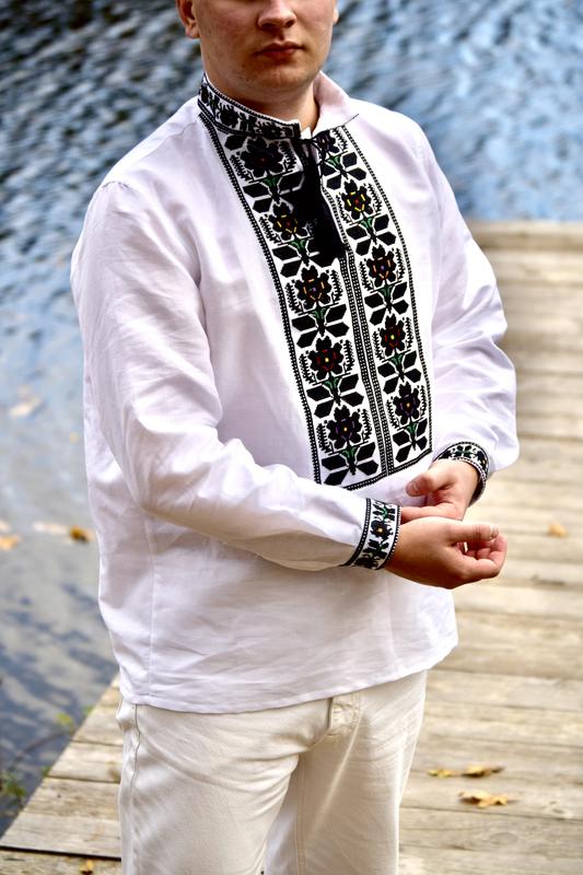 Чоловіча одноколірна вишиванка у білому кольорі виконана в українських традиційних мотивах. Вишивка чорного кольору Тканина - льон, склад тканини -60% льон 40% бавовна Розмір по коміру від 39 до 44 Заміри здійснюються по кожного розміру вишиванки вручну, тому допустима похибка +-2 см