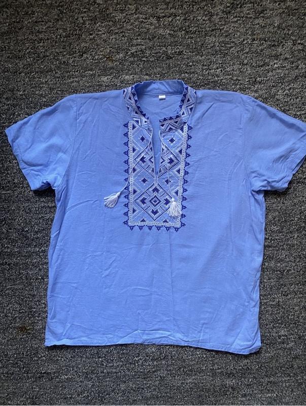 Вишита чоловіча сорочка на короткий рукав, у розмірі M. Колір блакитний, комірець на стійку +зав’язки на шиї. Розмір відповідає європейському 38 або українському 46 (заміри є на фото, підійде і на L). Нова, не підійшов розмір, ціна, за якою було куплено, вказана на останньому фото.
