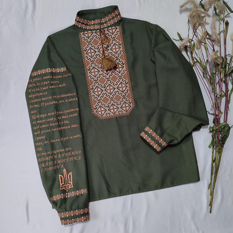 Вишита сорочка чоловіча ◽Ціна 1200 грн ◽ Тканина: льон-віскоза ◽Колір: хаки ◽Розмір: L-XL (48-50) ◽Заміри: ПОГ 56 Довжина 68 Довжина рукава 69 🚨📍можливе виготовлення на замовлення 🚨📍можливе відхилення в замірах +-1 см