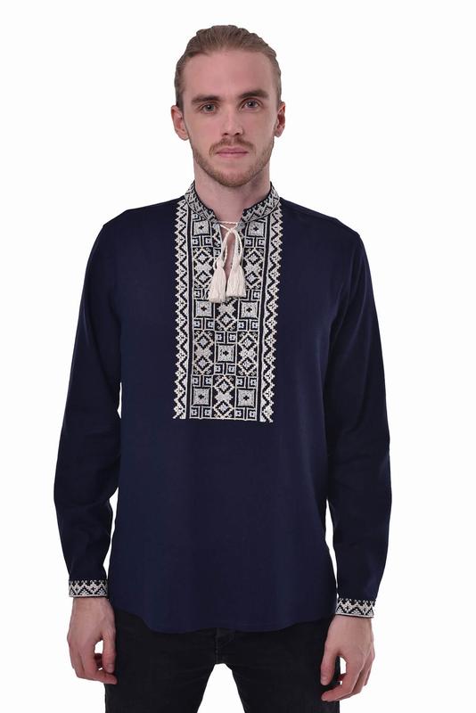 Розкішна вишивка на чоловічій сорочці «Подоль» є прикладом віртуозної роботи наших майстрів-вишивальниць. Вона виготовлена за мотивами традиційної підольської вишивки, яка вважається однією з найскладніших в Україні. Бачимо тут квадрати, ромби, трикутники, завитки, безперервні лінії — кожен з елементів має своє значення й покликаний стати оберегом, принести вам удачу та надихнути нові досягнення. Вишивка, розташована на пілочці, комірі та манжетах, виготовлена з вовняних ниток молочного та світло-блакитного відтінків. Сорочка має прямий вільний крій і виготовлена з високоякісного льону темно-синього кольору.