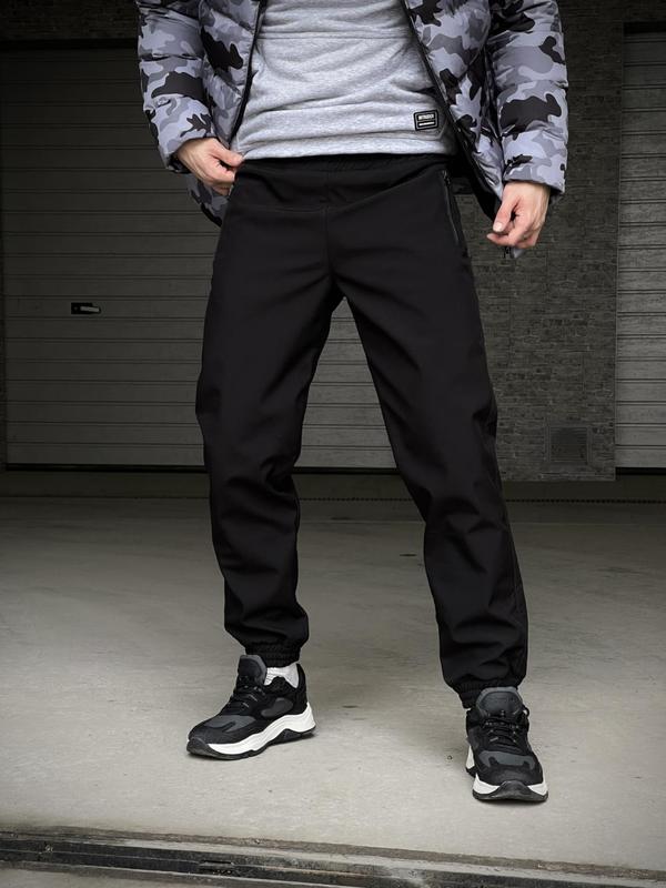 - Матеріал – Softshell - усередині приємний, м'який мікрофліс - у виробі 2 кишені на змійці - Вгорі виріб регулюється резинкою. - Внизу штани фіксуються з манжетою з гумки