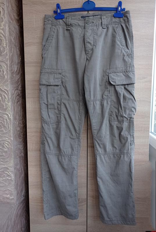 Штани LOGG бавовна. Розмір 30. Ширина по поясу 43.5 см, ширина по стегнах 52 см, довжина штанів 103 см, довжина штанів по кроковому шву 80 см, ширина низу штанів 22 см. На поясі ззаду з двох боків ледь видно сліди від розпортих виточок, і верх пояса в одному місці протерт (на фото все показала). Загальний стан дуже гарний.