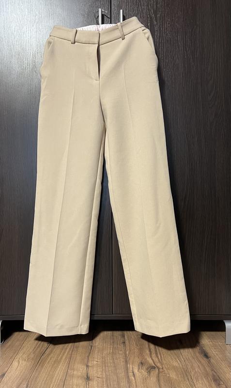 Невероятно шикарные прямые брюки дорого бренда Ткань довольно плотная и тяжелая Состав вискоза, эластан, полиэстер Очень красивого бежевого цвета Косые боковые карманы, сзади карманы обманки Эти брюки как деловой стиль, так и нарядные Вещь очень качественно пошита. Покупала в три раза дороже. Не носились. Есть все бирки. Застегиваются на металические крючки, пуговицу и молнию. Талия-36 Бедра-48 Ширина штанины по низу-26 Посадка-30/35 Длина штанов-112