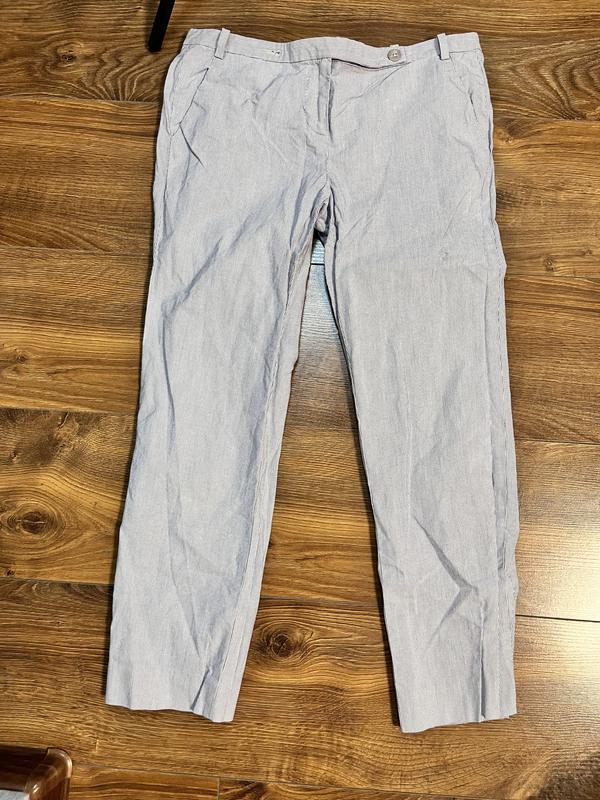 Легкі брюки в дрібну смужку для хлопчика Стильні та зручні штани прямого крою, виконані з легкої тканини, ідеально підходять для літа чи весни. Світлий відтінок з ледь помітною сірою смужкою робить їх універсальними – підійдуть як для офісу, так і для повсякденних образів. ✅ Прямий фасон ✅ Легка дихаюча тканина ✅ Шльовки для ременя ✅ Застібка на гудзик і блискавку ✅ Бокові кишені 📏 Розмір: • ПОТ – 40 см • ПОБ – 44 см • Довжина – 80 см Стан: відмінний Ідеальний вибір для гардеробу – з сорочкою, футболкою чи худі виглядатимуть однаково стильно.