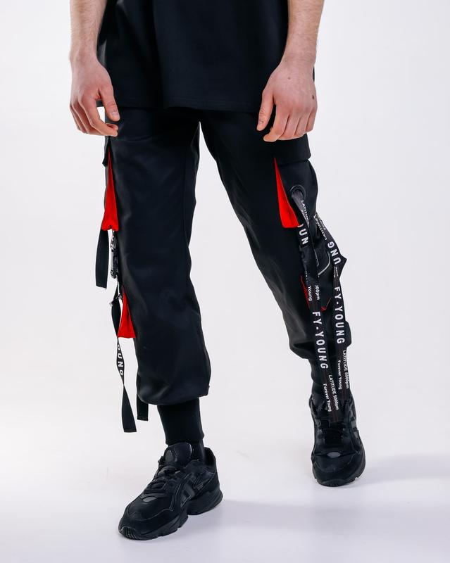 💥 Джоггеры YOUNG💥 🚦Цвет: Черный. 👖 Размеры: M, L, XL, 3XL. ✅ Детали: принт - качественная печать; пояс - резинка со шнурком; шесть карманов: два внутренних боковых сверху спереди, два накладных без застежки и два накладных с застежкой-молнией по бокам; низ - манжет-резинка. ♻️ Материал: хлопок - 65%, полиэстер - 33%, эластан - 2%.