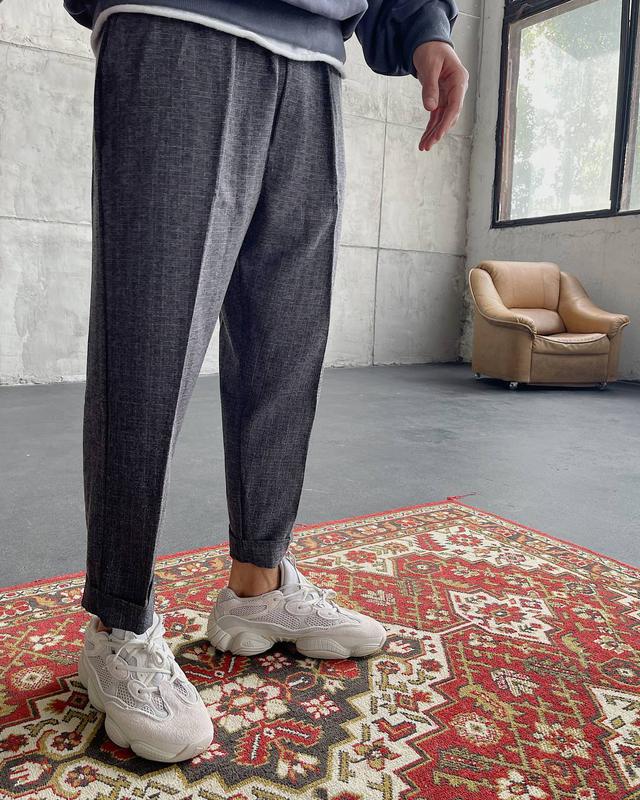 • Матеріал: Тіар (Дрючка • Склад: вовна (30%), бавовна (40%), віскоза (28%), еластан (2%). • Колір: Графіт • Опис: Штани виконані в стилі кежуал. Пояс на резинці так само присутній шнурок. Модель вільного крою. Запрасовані стрілки вздовж всієї довжини штанини. Внизу підгорнутий манжет.