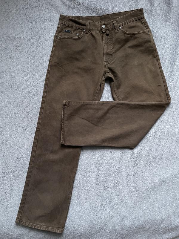 Щільний катон. Є невеликий брак (зелена плямочка ззаду штанів. На останньому фото видно). При носінні джинс пляма непомітна. Розміри: Пояс 42 Довжина штанини 100 Посадка 35 Обсяг стегна 28