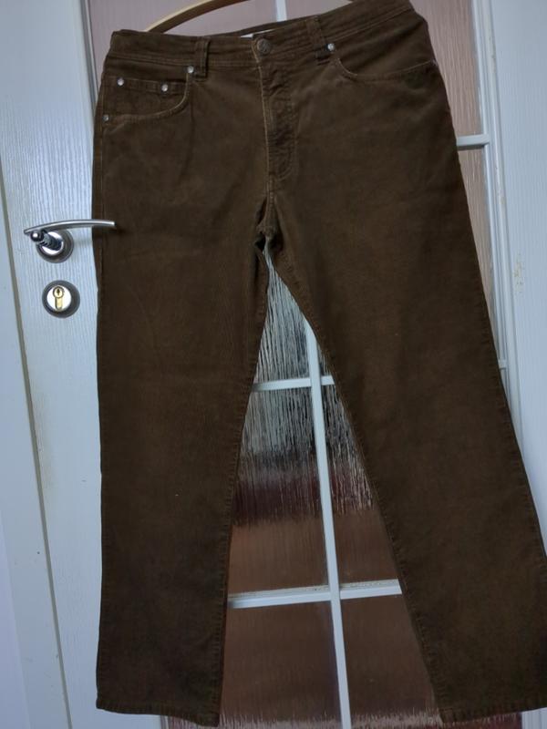 дрібний вельвет, колір болотний, пляшковий/чуть темніший, ніж хакі/, колір дуже цікавий і незвичайний. матеріал складається на 98 відсотків з бавовни, решта еластан. передні кишені бічні, задні накладні, ґудзик і заклепки все із зазначенням бренда. правій передній кишені вишивка із зазначенням логотипу бренда. річ якісна, бренд відповідає. розмір вказаний M, заміри см. піт 42, поб 57, ширина штанини 31, довжина від пояса до низу 100, ширина на виході 19.
