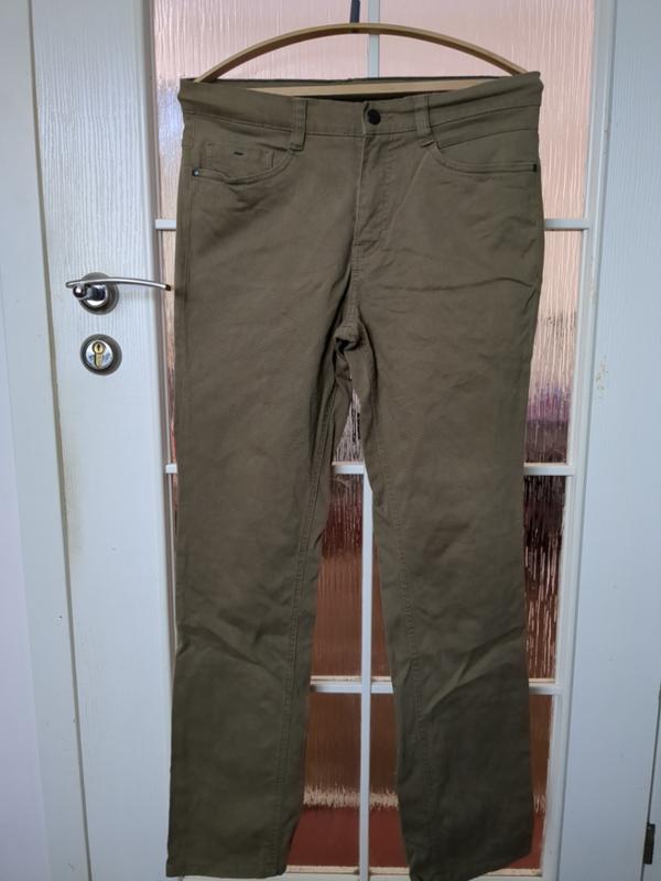 щільний і досить товстий матеріал, що складається на 97 відсотків з бавовни, решта еластан. тканина красивого та модного кольору хакі. в іншому джинсова класика, дві передні кишені, дві задні. варто додати, що вони мають класний вигляд. на фото дещо спотворений колір. розмір вказаний M. виміри см. піт 42, поб 54, ширина холоші 30, довжина від пояса до низу 106, ширина на виході 20.