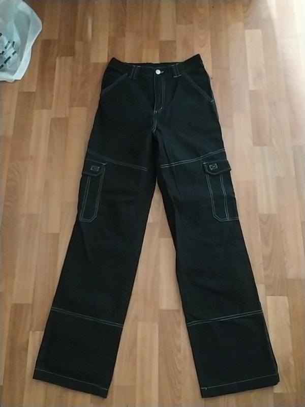 Штани чорні прямі з карманами - 2 попереду, 2 позаду, 2 з боків. 100% бавовна. На талії ззаду резинка. посадка висока ПОТ 36-39, ПОС 48, довжина по зовнішньому боковому шву 113, по внутрішньому 86, ширина штанини знизу 23