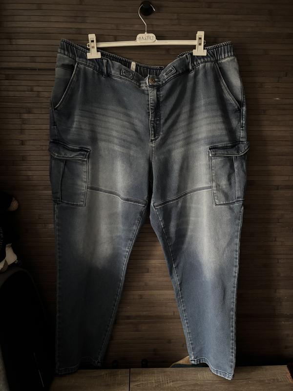 Гарної якості джинси, стрейчеві, в ідеальному стані. Котон з віскозою та еластаном, тягнуться. На поясі резинка . Завужені. Пояс 60-70, посадка 34, поб 67, довжина 106, ширина знизу 20, зверху 40.