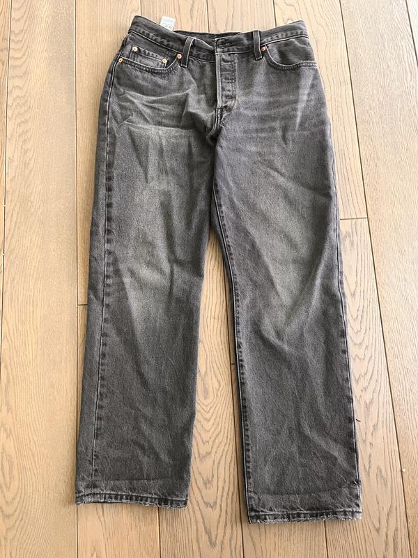Джинси Levi’s, класична модель 501, прямі, класно підійдуть на оверсайз . Темно сірого/чорного кольору з невеликими потертостями. Денім високої щільності. Хороша посадка. Вдягались пару раз, внутрішні шви не затерті ПОТ - 41, ПОС -53 Довжина по внутрішньому шву - 77 см Довжина по зовнішньому шву - 103 см