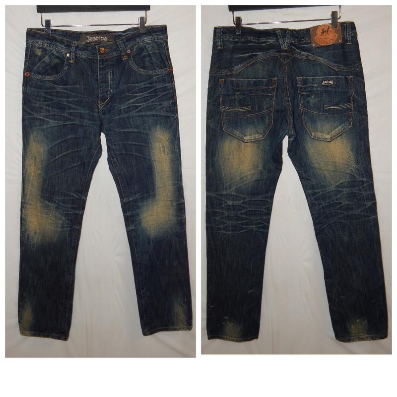 Джинсы JUSTING JEANS (Italy). Size W34 Чудовий стан Джинси виготовлені: потертості, рвані елементи, тип мастики Застібка на ґудзиках, середня посадка, тому сидять нижче талії П'ятикарманна модель Регулярний крій Розмір W34 на 48 щільний — 50 із замірами: пояс НОТ 44 см, посадка 26 см, довжина 110/84 см, ширина в стегні (пах) 30 см, коліно 22 см, вихід 20 см